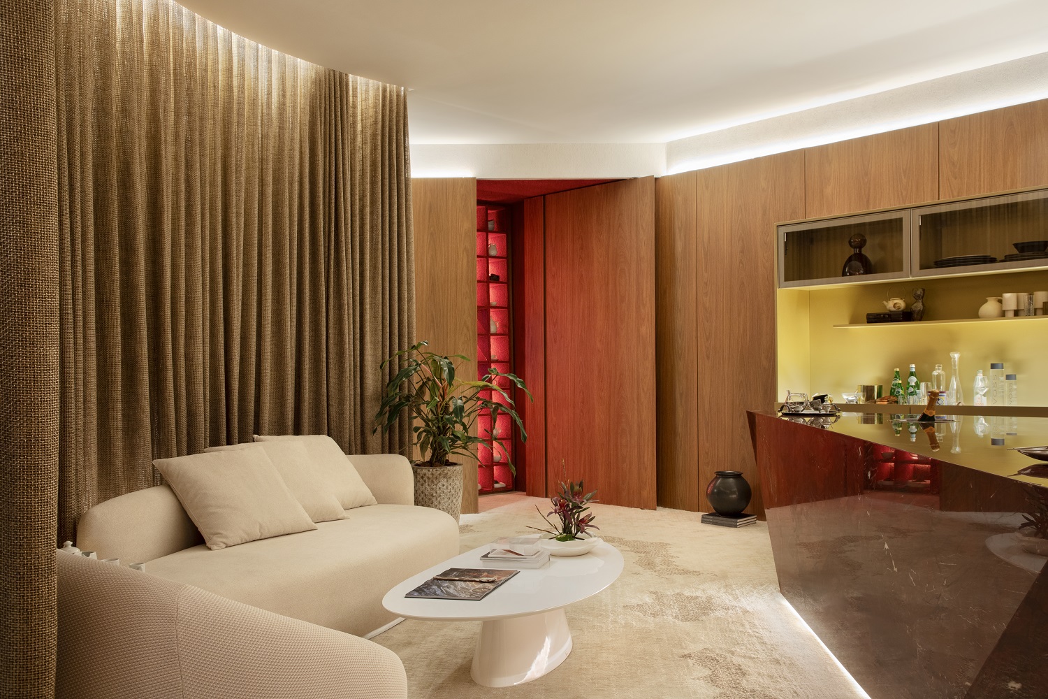 Inspirado nas antigas salas de chá, lugares de recolhimento e encontro, o projeto se abre como um espaço de convivência. Uma sala onde cozinhar, servir um chá ou abrir um vinho se transforma em ritual; onde o cotidiano desacelera e o agora encontra abrigo. No centro, uma bancada vermelha visceral, da Granihouse. Esculpida em mármore intenso, com veios que lembram pulsação e vida, ela se torna o eixo do espaço, o ponto gravitacional que reúne e move tudo ao redor.