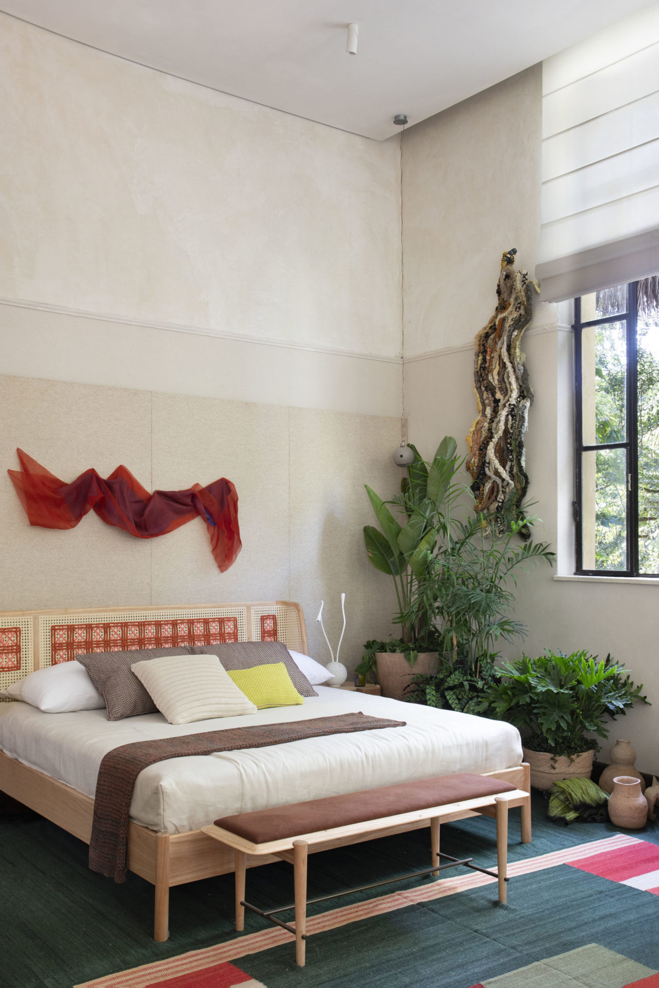 Outros destaques são a mesa de centro Sofia, de Mônica Geronimi; a cadeira Abapuru e o revisteiro MR, da Gisela Simas; as mesas laterais Temaki e o banco Xaxado, da Mula Preta; as cadeiras de jantar Daav, do Sergio Rodrigues; e a cama Zoé com cabeceira de palha customizada com bordado exclusivo, feito pelas bordadeiras do Movimento Transbordar.