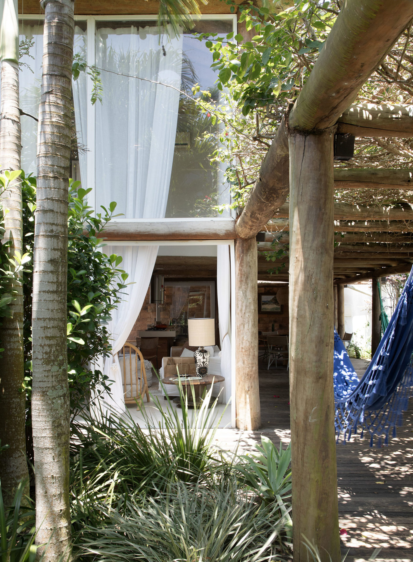 A arquiteta conta que realizou um sonho antigo de construir uma casa de praia com materiais ecológicos e naturais, valorizando ao máximo o verde da vegetação nativa e do paisagismo. Por isso, toda a estrutura foi montada com toras de eucaliptos de reflorestamento, com fechamentos de panos de vidro para privilegiar a entrada de luz natural e forro do teto em fibra natural trançada.